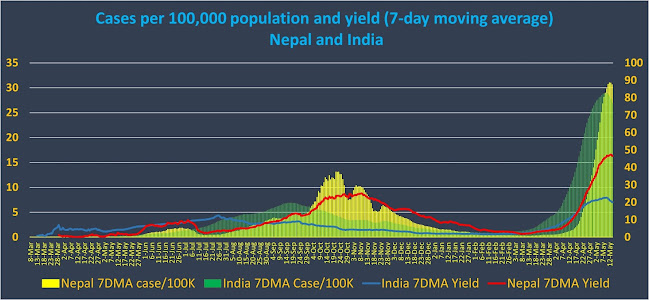 Figure 3 shows Nepal’s exponential growth of new cases and deaths in Baisakh. In one month, Nepal identified 159, 960 new cases from 411,260 tests (RT-PCR) conducted. This gives a monthly yield of 38%. The consistently high yields show that the virus was widely spread and that the testing was largely inadequate. At the beginning of the month, the cases per million population was only 19 cases/million but by the end of it had swiftly moved to 284 cases/million. To compare with the first wave, the high for 30-day new cases was 95,160 between Oct 7-Nov 5, 2020.