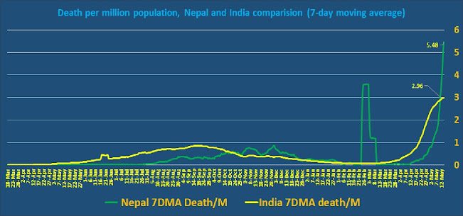 This surge had a direct adverse impact on mortality. As seen in Figure 2, through April, India’s death/million people was 4-5 times larger than Nepal’s (death/million people). Around May 5th, this gap was closed to half of that and by May 12th, Nepal had already nudged ahead of India with 3 deaths per million population. By May 14th, Nepal’s deaths per million populations stood at 5.5. This demonstrates how overwhelmed the health care system was resulting in a unusually high number of deaths.