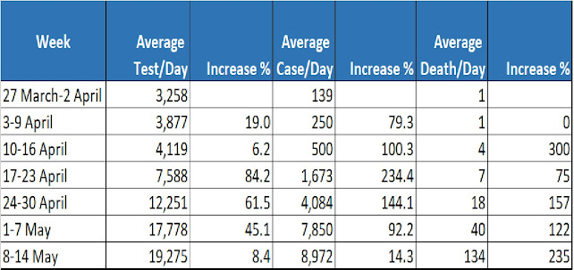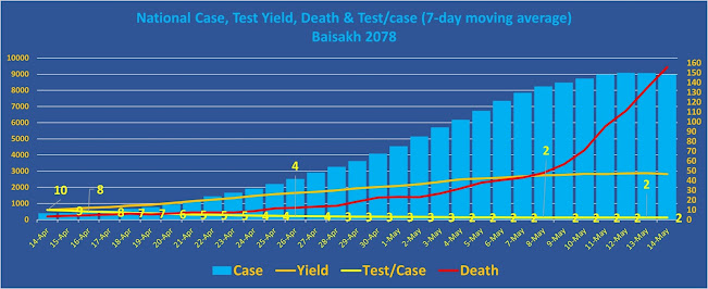Table 1 shows that weekly cases against the previous week accelerated when compared against the increase in weekly tests from April 10 – April 30. Notably, this pace of increase was somewhat stable in the last two weeks. This provided some faint glimmer of hope of a possible slowdown. During the month, average deaths per day continued to increase reaching 134/day in the last week. Apart from increasing deaths resulting from overburdened health facilities, this could partly be because of the adjusted data that now takes into account the additional bodies managed by Nepal Army. These adjustments have been made in the past several days. It is evident that the “law of the large numbers” played out in Nepal and a very rapid increase in cases resulted in an unprecedented level of deaths.