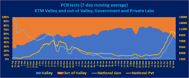 For most of Baisakh, the increase in testing came from the private labs and from tests within the Kathmandu valley although cases were surging across the country (Figure 4). It was only in the last two days of the month that the seven-day average of tests from the government labs surpassed the private labs. For the first week of the month, testing level in the government labs was around half of the private labs. This reached around 70% by May 1st. Looking at it another way, we can summarize that at the beginning of the month, the government labs were doing only around 37% of total daily tests nationally. This increased to 40% by May 1st and only by May 13th the government-run labs were doing 50% of the national daily tests. This is important because tests from the government-run labs have no cost barriers as they are all free while the private labs charge at least Rs 2000 per test.