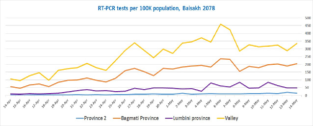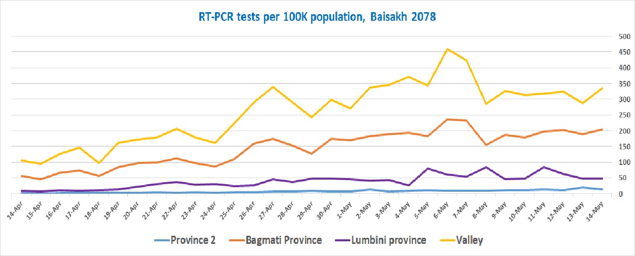 In Kathmandu valley, the % positivity average reached above 10% around the first week of Baisakh (week of April 13) and reached 40% by the third week of the month. Although, the situation was worsening both within and outside Kathmandu valley, tests were relatively ramped up only in Kathmandu valley for most of Baisakh.