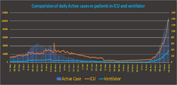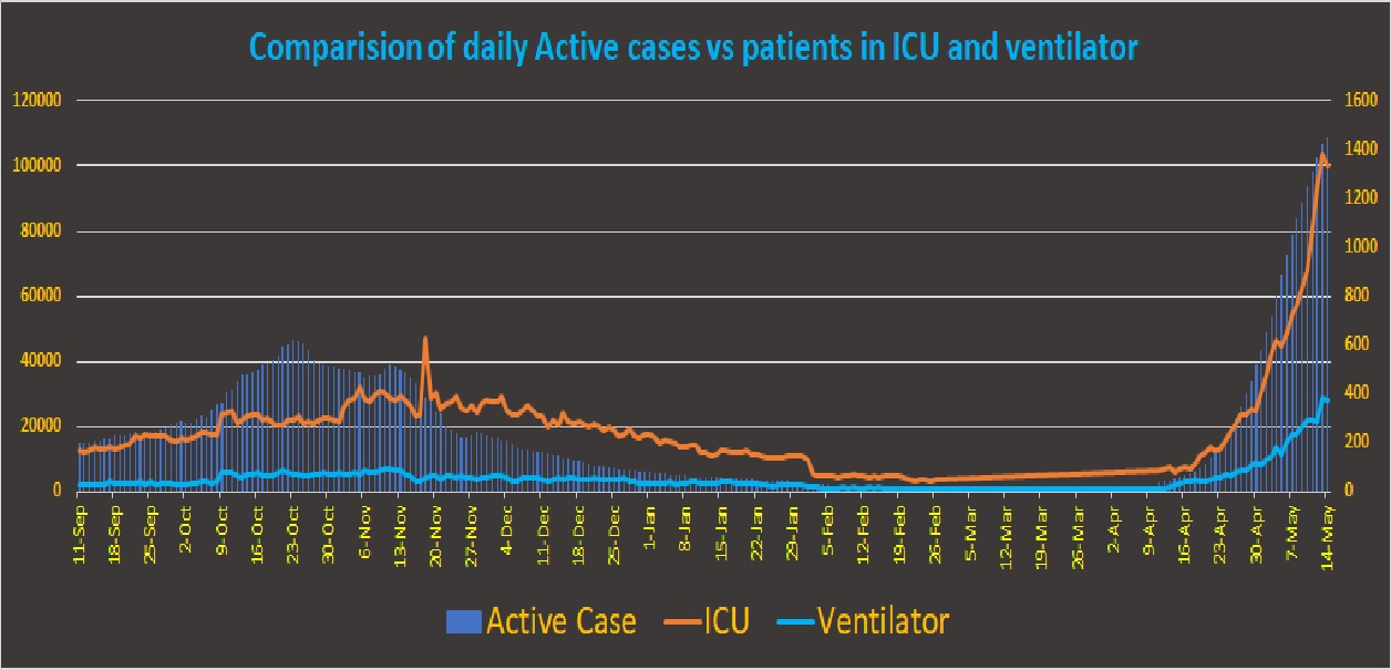 The rapid increase of new cases caused a higher number of hospitalizations need in a very short time. As a result, hospitals were suddenly seeing overwhelming number of cases requiring the care for moderate to severe symptoms. Active cases nationally swelled by more than 26 times in just one month moving from 4000+ at the beginning of Baisakh to more than 100,000 by the end of it. By the accounts of the Ministry of Health and Population, Nepal, people in ICU care and on ventilator increased by more than 15 times within the month. As a result of this exponential growth, there were 371 people on ventilator care by end of Baisakh (Figure 6).