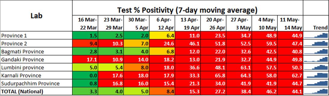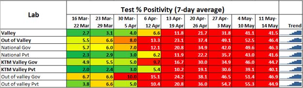 Similarly, at the beginning of the month, 72% of the total national tests was being done only in the Kathmandu valley. By May 1st, this dropped to 63% and reached parity by May 13th as tests were finally increased up outside the Kathmandu valley. As the percent positivity was extremely high outside Kathmandu valley, the ramping up of tests outside Kathmandu valley was slower than required. (Figure 4)Table 2 shows the 7-day average for percent positive for the labs within the Kathmandu valley and outside. The percent positive outside the valley had started to go up two weeks before Baisakh. In the week of April 6, the % positivity average had already reached 11%. This was a sign of the development of a serious situation. The average quickly spiraled out of control and remained above 45% for the last three weeks of the month.