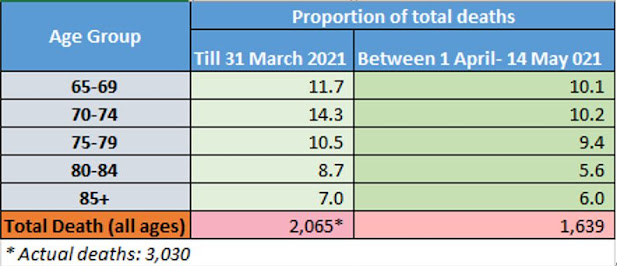 As the vaccine coverage so far is extremely small, it is understandable that a large proportion of the population is still unprotected. This can explain the high hospitalization and deaths the surging cases are causing. It is useful to see if the vaccination is having any positive impact among the population already vaccinated. In order to carry out a very rough indirect assessment, we looked at mortality data for the 65+ age group who were provided the first dose of Covishield vaccines in the second round of vaccination drive. This round had coverage of more than 60% of the target set and was completed on March 16th. We divided total national deaths for period before April 1 and after April 1 till date. We chose April 1 with the understanding that by then, two weeks of vaccination would had elapsed for those vaccinated in the round. So although vaccinated only with a single dose, we tried to indirectly assess if the ones vaccinated were protected more.