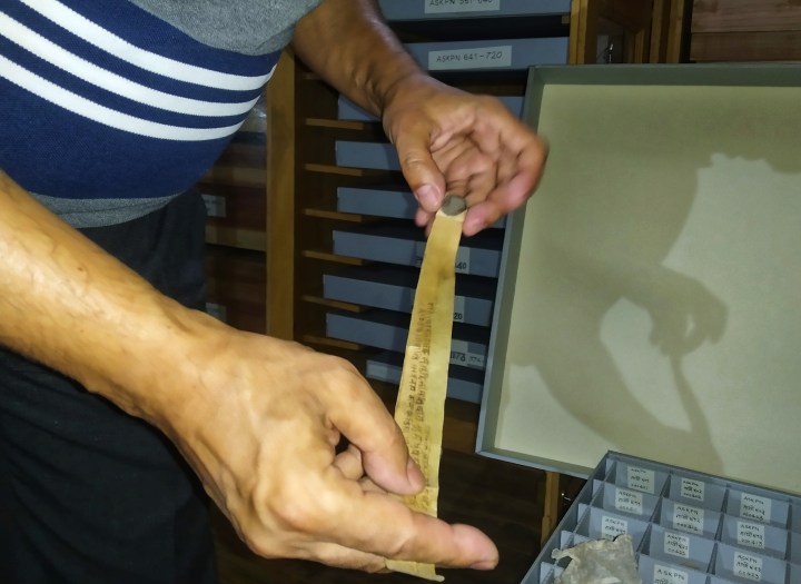 Librarian Sharad Kasa shows one such land grant document